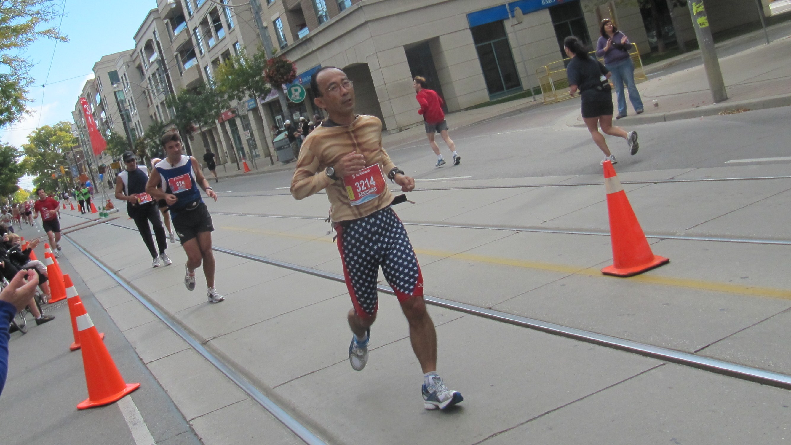 I have a soft spot for Scotiabank’s Toronto Waterfront Marathon. I always think of it as the marathon that got away. Flashback to 1998: Oh how I wished I had run this flat, breezy, cakewalk instead of the Toronto International Marathon with its up and down hills in Hog’s Hollow and Forest Hill. And on that particular day, October 18, the weather was cold then hot, then rainy, then cold again. The only thing consistent was the wind although even that seemed to change direction. I learned a few things that day though: hills are for skiing and running is for people who have somewhere to go. Which is why now I just like to stay put and watch others go places. The Waterfront Marathon is perfect for that because the weather is always just right and the 35 kilometer mark is at the bottom of my street in front of Starbucks. The runners have 7 more k’s to go to finish the whole 42.2k’s . The last quarter is the toughest and most intense so it’s important to cheer these athletes on. I remember losing my pace bunny at the 30 k mark but I adopted two finely dressed Italian men both of whom were worried about what the humidity was doing to their hair. And I had problems of my own, I had lost my shirt(!) on Rosedale Valley Road and I had severe upper buttcrack chafing issues because I should have cut the tags from my shorts. Fun times! But in a marathon, anyone who crosses the finish line is a winner but some are more winny than others.