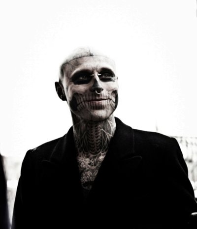I love the Zombie Boy.  I think he needs a realty show.  Most of the pictures you can find of him are glamour shots. He’s got modelling career and was in Lady Gaga’s “Born This Way” video.  Beyond the ink, he is a 26 year guy from Chateauguay, Quebec.  He mostly poses all stoney faced but he’s very cute when he smiles. I’d like to see him brush his teeth and maybe do a Spinning class and go to Loblaws, the kind of stuff I do.